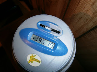 My former change jar was replaced with one of those big gallon-sized plastic jugs you get pretzel sticks in. When this photo was taken earlier this morning, it was half-filled, and weighed in the neighborhood of 15 pounds (by my estimating). How much was in here? Well, I also had a coin counter attached to the lid, and the grand total was:
