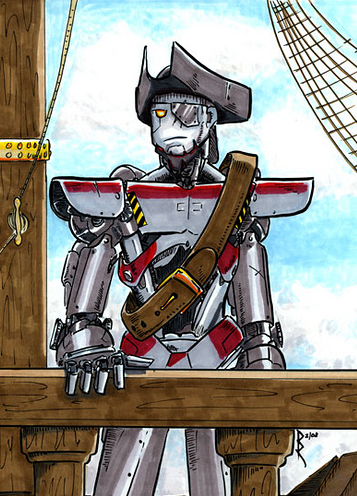 YO-0-0 (pronounced "Yo-oh-oh") once was an Ancient navigational 'bot used on a cruise ship. After the Apocalygeddon, the ship was grounded, the passengers either fled into the Hellscape or died on board, and YO-0-0 was left alone on board. He spent decades wandering the decks of the abandoned liner, trying to rediscover a sense of purpose. A chance discovery of an old "Captain Blood" DVD in the ship's library resparked his "primary function" subroutine, and he spent the next few years watching every nautical holovid and reading every pirate-themed book he could find. He eventually remade himself as the greatest corsair ever to sail the Nine Seas. He rebuilt and relaunched the ocean liner (with the help of the remaining functional ship's 'bots -- reprogrammed by YO-0-0 to be his pirate crew) and now he plunders and pillages as he pleases. Everyone fears the approach of the pirate ship "Disney Magic."