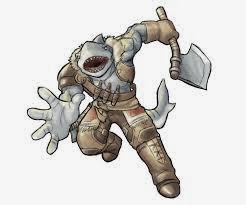 Mako are half-man, half-shark humanoids who live in underwater oceanic communities. Mako (the term is both singular and plural) are able to breathe air as comfortably as they do water, and they will come ashore if they see a need to do so -- usually to hunt if their oceanic food sources migrate or begin to dwindle. Mako are in a constant state of hunger due to their increased caloric needs drawback. Due to this, Mako society is an isolated one as they fear that The Mindless Hunger will strike while socializing with other intelligent creatures. Their weak will causes them to have little control and act impulsively when the need to feed arises. Although Mako are, by nature, quiet, thoughtful humanoids, stories and legends of "the Man-eaters" have already filled most with fear of these huge ravenous creatures.