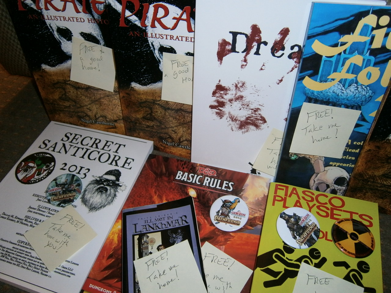 - Inspired by an earlier G+ post, I brought a stack of unwanted gaming materials that I left throughout the convention's halls with "FREE TO A GOOD HOME" stickers on them. Every so often, I'd leave some random goodie out for someone, and it'd be gone in minutes. Enjoy!