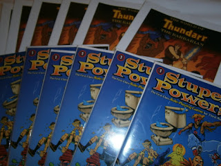 - After a quick breakfast of bagels and Monster drinks, I arrived to run three hapless "superzeroes" through Stuper Powers -- The First-Rate Game of Third-Rate Heroes. We had a great time with much "Mystery Men"-type super-mayhem! The superteam consisted of Super Snot Bros. (a sewer-travelling phlegm-thrower who had more than a passing resemblance to a certain videogame plumber); Kaptin Kardashian (a white leotard-wearing heroine with blizzard dandruff and muscular thighs that can cut girders in half); and Ragnar the Mighty (the Norse viking who can call down Valkyries to do his bidding and "The Spear of Destiny (?)" with its random assortment of misfiring powers). While touring the Smithsonian, some deactivated Dreddroids became active! Super Snot Bros. fired glue-like mucus at the rogue bots (Battle cry: "Bless me!") while Kaptin K. tore their arms off with her Thighs of Doom (Battle cry: "I'm too hot for this!") Ragnar joined the fight in progress, and managed to bring down Valhalla's wrath! (Battle cry: "Fear my righteous spear and woolen pants!") A mighty battle ensued at other Washington landmarks such as the Washington monument and the Capitol before the final showdown with Dr. Dredd at the Pentagon. It was like a live-action Tick cartoon, and we laughed and joked and had a great time. I rewarded their awesome play with new copies of the Stuper Powers rules. Thanks for the great game guys!