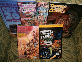 Stopped by the Goodman Games booth to pick up some DCC RPG stuff I didn't yet have. Lots of new stuff was offered, including "Synthetic Swordsmen of the Purple Planet", a new Purple Planet adventure by Jim Wampler!
