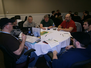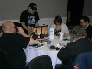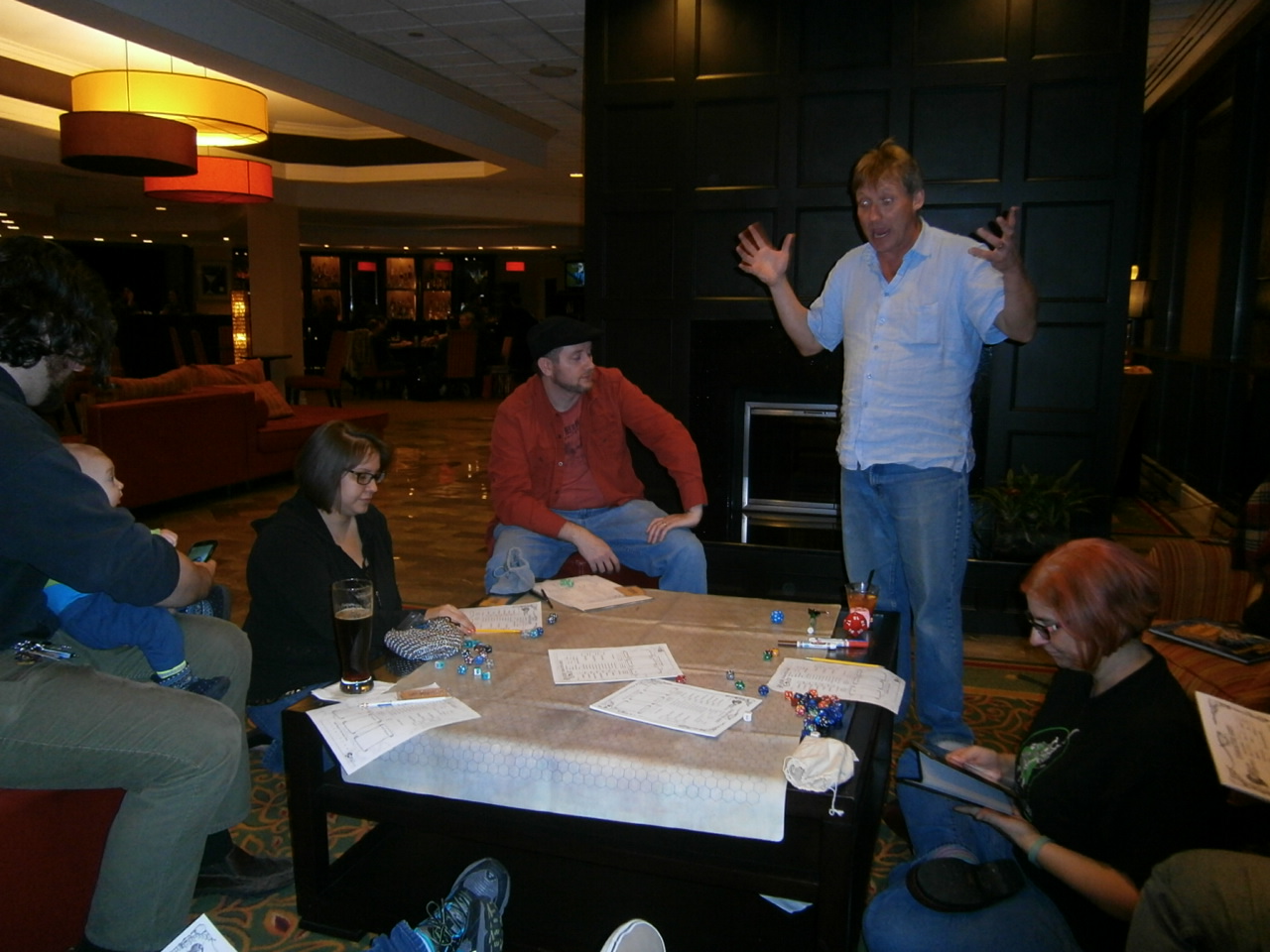 - After swinging by my room for a quick rest-and-recoup session, I sauntered back to the gaming area to run a horror-filled game of Cryptworld! I was planning to run a new adventure, "Wasted," but I didn't get it hammered together in time for the event. So I ran a game I've run before, "Unquenchable." My intrepid group of six rescuers were sent into the woods near Akron to find three hunters that had gone missing. Not to spoil anything, but the party did quite well, taking on most of the shadowy horrors with ease. It got dicey at the end when I nearly killed a player by having a giant THING score two critical hits as it chewed on him, literally beginning to swallow him alive. The final killing blow was the only thing that saved him. I hope my players enjoyed the game!