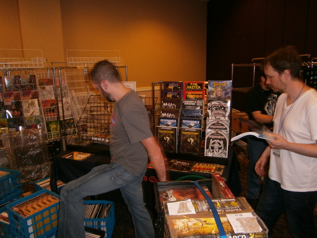Roy Snyder highsteps through the frame as the Goodman Games booth starts to take shape earlier in the day.