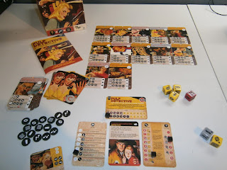 In Pulp Detective, you play a detective trying to solve one of three cases included in the base game. (More cases and options are available in the follow-up supplement which I'll describe later.) The game consists of various sets of cards that represent your detective, your held items, your stamina and clues found, the case you're trying to solve/timeline, and the deck that makes up the Storyline deck (Cliffhangers, Informants, and Follow The Lead cards). You also have a set of yellow Investigation dice, a red Paperboy dice, and a grey Underworld dice. Eight colored bits are used to mark your status on the various cards, and an assortment of black Twist Markers rounds out the contents. The art design of the game is AMAZING, using the covers and paintings from a variety of pulp novels to illustrate every scene and character you may meet. Even the box looks like it's been weathered and aged since the 1920s, lending a truly gorgeous design to the game's contents.