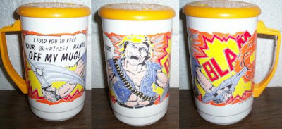 As you can see from the photos, the image is delightfully apocalyptic with a wild-haired, wild-eyed survivalist dressed in a tattered denim vest with a ammo bandolier crossing his chest. In one hand, he clutches a Bowie knife; in the other, he fires off some kind of automatic weapon. And during all of the chaos, he screams "I Told You To Keep Your @*#! Hands Off My Mug!"